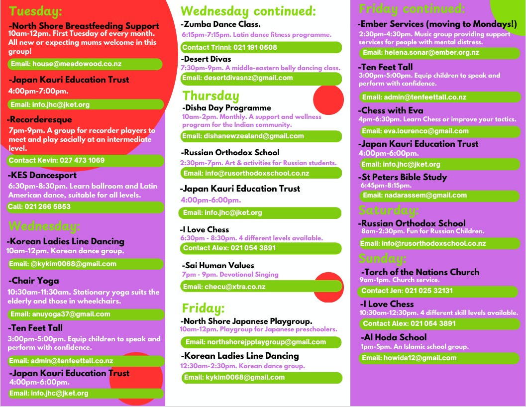 At Meadowood Community Centre (formerly known as Meadowood House) our purpose is to make available opportunities for the community to come together in support and connection of one another, and to create spaces to participate in educational, multicultural, physical, social and spiritual programmes.
